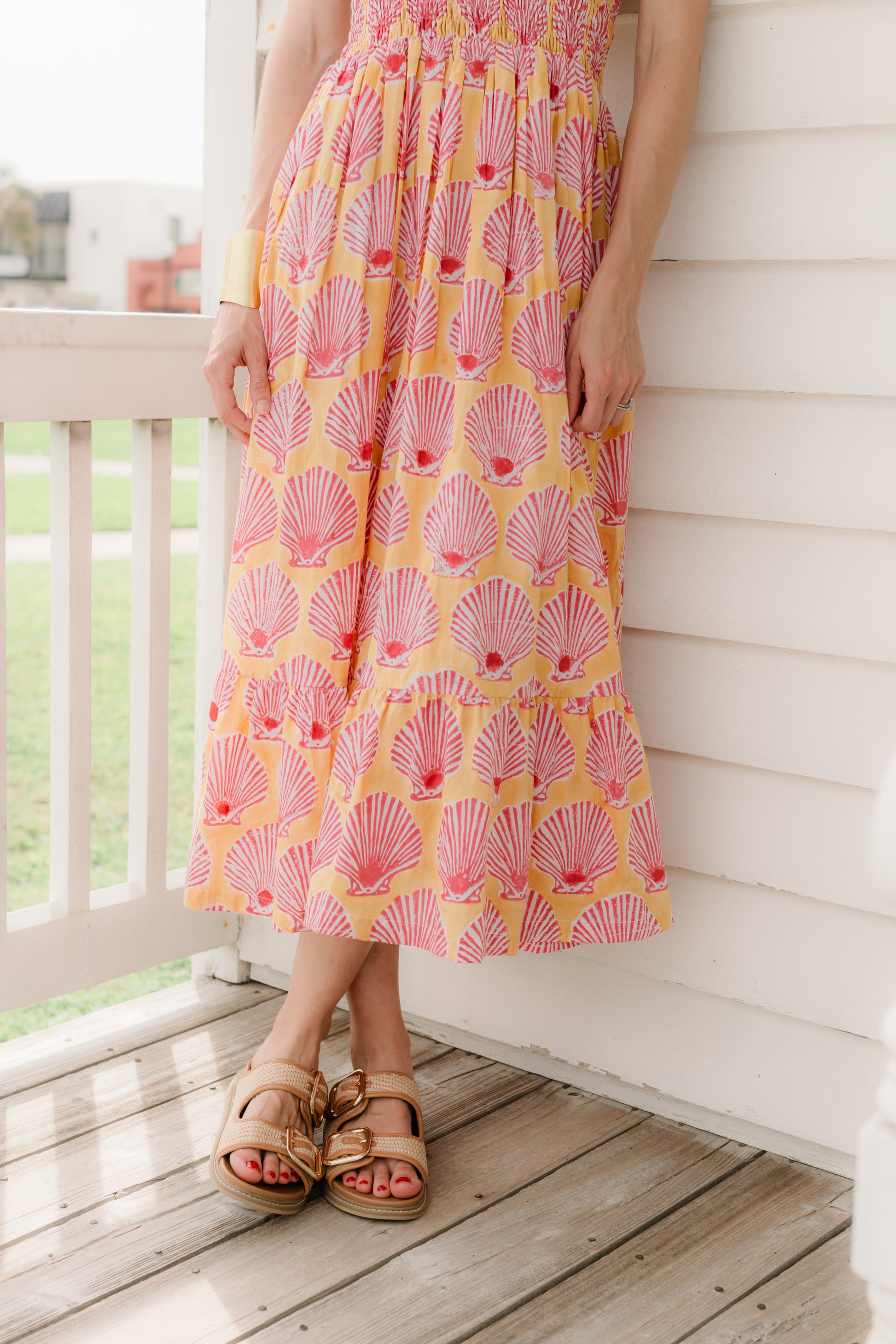 The Iris Dress in Mimosa is hand block printed and features a smocked bodice, beautiful ruffled sleeves, and a midi length fit. It is the perfect blend of fun, flirty, and effortless style. Our final summer prints-made to linger with you through the golden days of the season.
